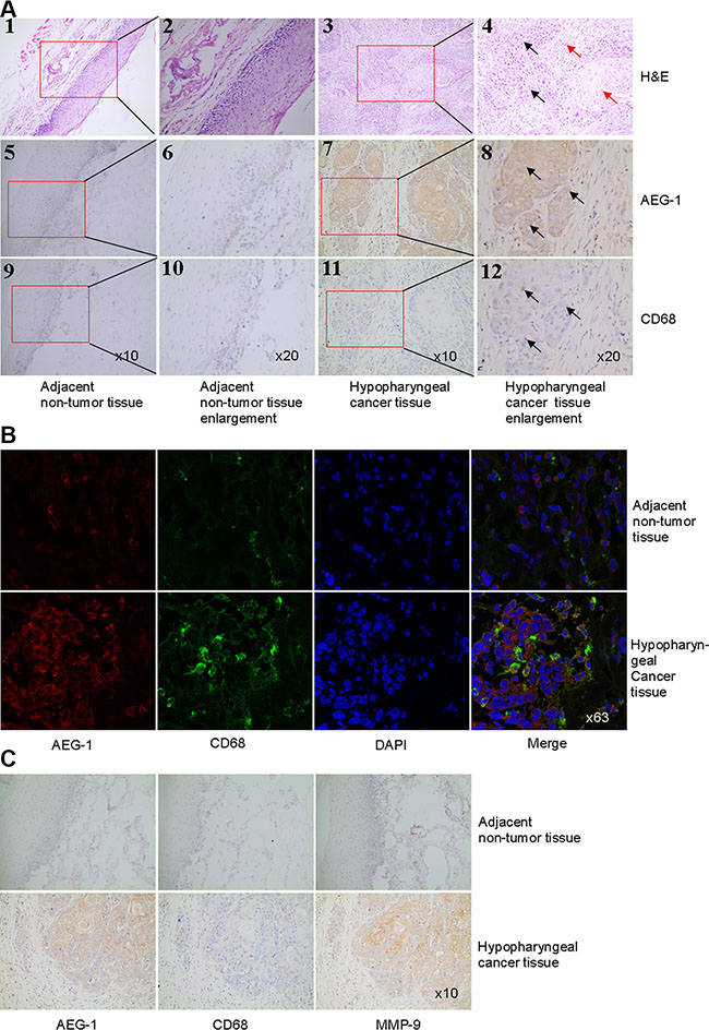Figure 1: AEG-1 was highly expressed in TAM and its expression was associated with MMP-9 expression in hypopharyngeal cancer. (A) H&E staining (1–4) and immunohistochemical staining of AEG-1 (brown staining, 5–8) and CD68 (brown staining, 9–12) were performed in hypopharyngeal cancer and non-tumor tissue. Higher magnifications of the boxed areas in (1), (3), (5), (7), (9), and (11) were shown in (2), (4), (6), (8), (10), and (12), respectively. The black arrows pointed out tumor nest and the red arrows pointed out tumor stroma in 4. The arrows in 8 and 12 indicated that AEG-1 was highly expressed in macrophages defined by CD68 in hypopharyngeal cancer. Magnification, × 10 and × 20. (B) Co-immunofluoresence staining with AEG-1 (red) and CD68 (green) in hypopharyngeal cancer and non-tumor tissue. Magnification, × 63. (C) Immunohistochemical staining of AEG-1, CD68, and MMP-9 in consecutive serial sections in non-tumor tissue and hypopharyngeal cancer. Magnification, × 10.