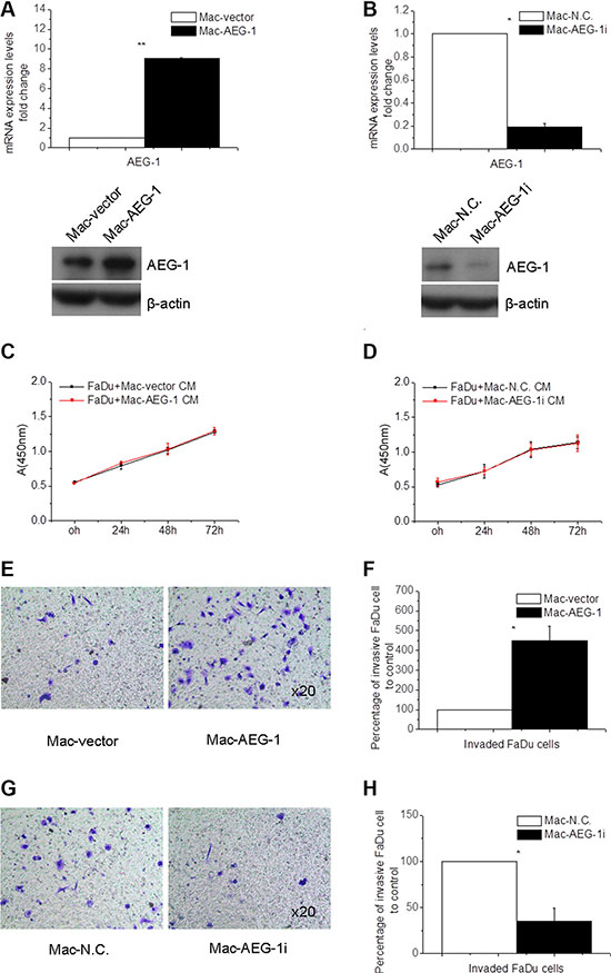 Figure 3: Macrophage AEG-1 promoted FaDu cell invasion. (A) RT-QPCR and Western blot analysis of expression level of AEG-1 in Mac-AEG-1 and Mac-vector. (B) AEG-1 expression at mRNA and protein level in Mac-AEG-1i versus Mac-N.C. (C) The proliferation of Mac-AEG-1 CM- or Mac-vector CM-treated FaDu cells evaluated by CCK-8 assay. (D) The proliferation of Mac-AEG-1i CM- or Mac-N.C. CM-treated FaDu cells evaluated by CCK-8 assay. (E) Representative pictures of invaded FaDu cells when co-cultured with Mac-AEG-1 or Mac-vector respectively in invasion assay. Magnification, × 20. (F) Quantitative analysis of invaded FaDu cells when co-cultured with Mac-AEG-1 or Mac-vector respectively in invasion assay. (G) Representative pictures of invaded FaDu cells when co-cultured with Mac-AEG-1i or Mac-N.C. respectively in invasion assay. Magnification, × 20. (H) Quantitative analysis of invaded FaDu cells when co-cultured with Mac-AEG-1i or Mac-N.C. respectively in invasion assay. Data were presented as mean ± SEM. *, significantly different at P < 0.05; **, significantly different at P < 0.01.