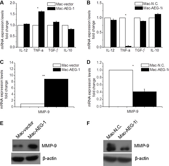 Figure 4: AEG-1 up-regulated MMP-9 expression in macrophages. (A) Detection of IL-12, TNF-α, IL-10, and TGF-β expression in Mac-AEG-1 and Mac-vector. (B) Detection of IL-12, TNF-α, IL-10, and TGF-β expression in Mac-AEG-1i and Mac-vector. (C) MMP-9 mRNA expression in Mac-AEG-1 and Mac-vector. (D) MMP-9 mRNA expression in Mac-AEG-1i and Mac-N.C.. (E) Western blot analysis of MMP-9 protein expression in Mac-AEG-1 and Mac-vector. (F) Western blot analysis of MMP-9 protein expression in Mac-AEG-1i and Mac-N.C.. Data were presented as mean ± SEM. *significantly different at P < 0.05; **significantly different at P < 0.01.
