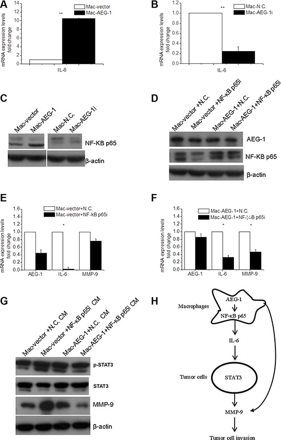 Figure 6: NF-κB p65 was involved in macrophage AEG-1-mediated up-regulation of IL-6 and MMP-9 in macrophages. (A) Detection of IL-6 mRNA expression in Mac-AEG-1 and Mac-vector. (B) Detection of IL-6 mRNA expression in Mac-AEG-1i and Mac-N.C.. (C) The effect of AEG-1 on the expression of NF-κB p65 in macrophages. (D) The efficiency of simultaneous transfection of siRNA and plasmid was measured by Western blot. (E) Relative mRNA expression levels of AEG-1, IL-6, and MMP-9 in Mac-vector+N.C. and Mac-vector+NF-κB p65i. (F) Relative mRNA expression levels of AEG-1, IL-6, and MMP-9 in Mac-AEG-1+N.C. and Mac-AEG-1+NF-κB p65i. (G) Detection of p-STAT3, STAT3, and MMP-9 expression in FaDu cells exposed to supernatants from Mac-vector+N.C., Mac-vector+NF-κB p65i, Mac-AEG-1+N.C., and Mac-AEG-1+NF-κB p65i. (H) A schematic representation of macrophage AEG-1 promoting the invasion of FaDu cells. Data were presented as mean ± SEM. *, significantly different at P < 0.05; **, significantly different at P < 0.01.