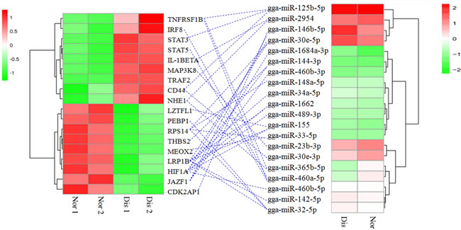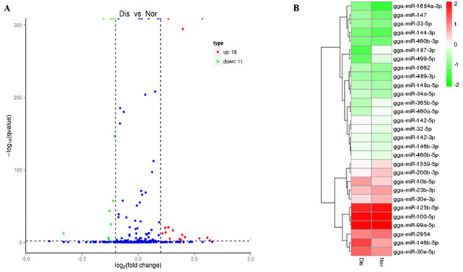 Figure 2: A. Volcano diagram displaying differentially expressed miRNAs between the Dis and Nor samples. The remarkably up-regulated miRNAs are shown in red, and down-regulated miRNAs are shown in green, whereas no difference is marked in blue with respect to the threshold of qvalue < 0.01 and |log2 (fold change) | > 1. B. Analysis of miRNAs expression clustering of Nor and Dis sample. Red indicates the high expression levels, blue indicates low expression.