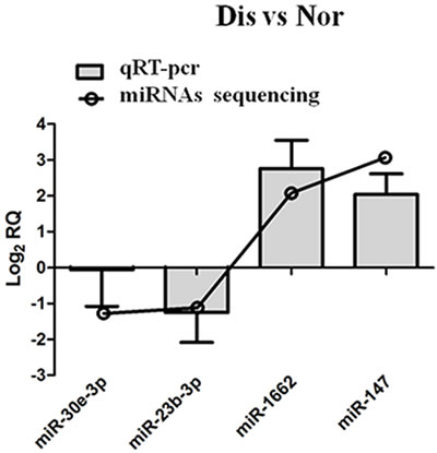 In the current experiment, a total of 424 known mature miRNAs was found by using miRBase; of which, 362 were found in the Nor samples, and 369 were found in the Dis samples. The modified mirdeep2 and srna-tools-cli also predicted 23 novel miRNAs, with 18 and 19 found in the Nor and Dis samples, respectively (Additional file 1: Table S1).