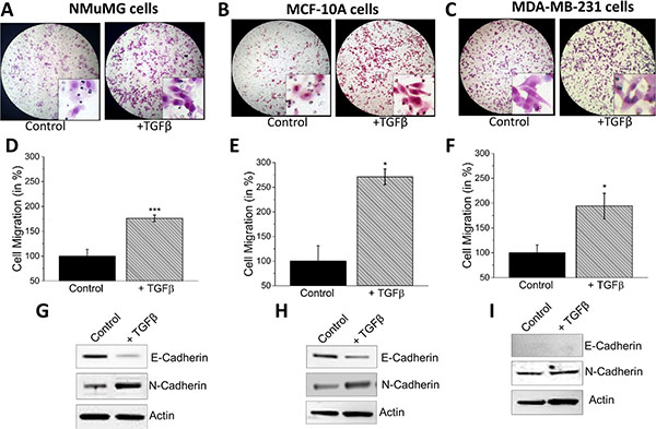 Figure 1: TGFβ induces EMT in NMuMG, MCF-10a and MDA-MB-231 cells. NMuMG. (A), MCF-10a (B), and MDA-MB-231 (C) cells were treated with 10 ng/mL TGFβ for 48 hours before being trypsinized, resuspended in serum free media, placed in transwell inserts with 8 uM pore membranes, and incubated for 6 hours and 24 hours (MCF-10A). Nonmigrating cells were removed from upper membrane and migrated cells were stained with hematoxylin and fixed. Magnification at 10×. (B, E, H) Four random fields at 10× were counted indicating total cells migrated, shown as percent change in NMuMG (D), MCF-10a (E), and MDA-MB-231 (F). Western blots showing E-cadherin and N-cadherin protein levels normalized to actin in NMuMG (G), MCF-10a (H), and MDA-MB-231 (I) after 48 hour treatment of 10 ng/mL TGFβ.