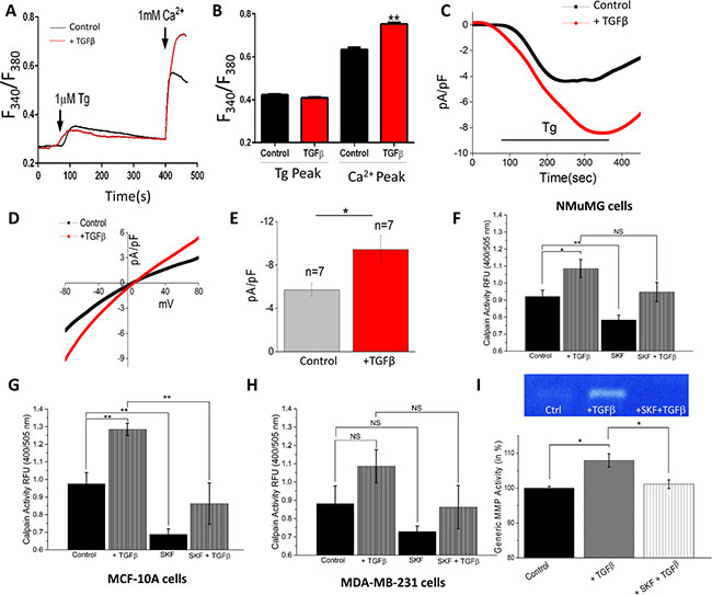 Figure 2: TGFβ Increases store-operated Ca2+ entry and [Ca2+]i and blocking Ca2+ influx reduces EMT calpain activity. (A) Representative Fura-2 traces showing the transient increase in [Ca2+]i after addition of 1 mM calcium to NMuMG cells pretreated with TGFβ for 1 hour. (B) Bar diagram quantifies Fura-2 Tg and Ca2+ peaks. Each bar gives the mean ± SEM of 45–60 cells in three separate experiments. (C) Application 1 μM Tg in bath solution induced inward currents at −80mV in control and TGFβ treated cells. Respectively IV curves under these conditions are shown in (D) and quantitation (n = 7 recordings) of current intensity at −80 mV is shown in (E). (F–H) Calpain activity measured as RFU using calpain activity kit from Abcam, in NMuMG (F), MCF-10a (G), and MDA-MB-231 (H) cells after treatment with 10 ng/mL TGFβ and/or 10 μM SKF96365 for 6 hours. Each bar gives the mean ± SEM (N = 4 independent experiments). (I) Culture media of NMuMG cells were collected for generic MMP activity measurements after treatment with TGFβ and SKF for 12 hours and shown as bar graph. Gel image shows MMP activity in various conditions as labeled.