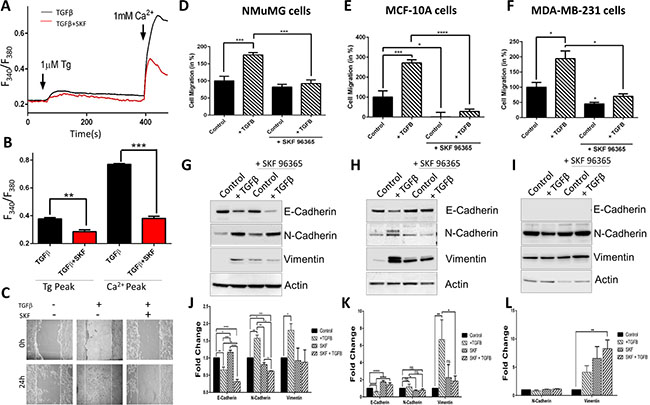 Figure 3: TGFβ induced Ca2+ entry, [Ca2+]i and migration is blocked by SKF96365. (A) Representative Fura-2 traces showing the transient increase in [Ca2+]i after addition of 1 mM calcium to NMuMG cells pretreated with 10 ng/mL TGFβ and TGFβ with 5 μM SKF96365 for 30 mins. (B) Bar diagram quantifies Fura-2 Tg and Ca2+ peaks. Each bar gives the mean ± SEM of 50–70 cells in at least three separate experiments. (C) Wound healing migration assay of NMuMG cells. Cells as indicating were treated for 24 hours, then confluent cells were treated with 10 mM Mitomycin C for 2 hours and then scratched indicated time 0. Transwell migration of NMuMG (D), MCF-10a (E) and MDA-MB-231 (F) cells treated with TGFβ (10 ng/mL) and/or 5 μM SKF96365 for 48 hours and migrated for 6 or 24 (MCF-10a) hours. Four random fields at 10x were counted indicating total cells migrated, shown as percent change. (G–I) Western blot showing E-cadherin, N-cadherin, and Vimentin protein levels normalized to actin with 40 ug total protein load after 48 hours in 10 ng/mL TGFβ and 5 μM SKF96365 treatment (along with quantification) in NMuMG (G, J), MCF-10a (H, J) and MDA-MB-231 (I, L).