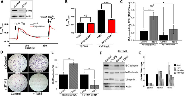 Figure 4: siSTIM1 reduces the effect of TGFβ induced migration, calpain activity, current, and [Ca2+]i. (A inset) STIM1 was knocked down in NMuMG cells using siRNA with Western blot showing reduction. (A) Representative Fura-2 traces showing the transient increase in [Ca2+]i after addition of 1mM calcium to siSTIM1 cells and control cells with 10 ng/mL TGFβ pretreatment for 1 hour. (B) Bar diagram quantifies Fura-2 Tg and Ca2+ peaks. Each bar gives the mean ± SEM of 55 separate experiments. (C) Calpain activity measured as RFU using calpain activity kit from Abcam in siSTIM1 and control cells after treatment with 10 ng/mL TGFβ for 6 hours. Each bar gives the mean ± SEM (N = 4). (D) Transwell migration of siSTIM1 cells after treatment with 10 ng/mL TGFβ for 48 hours and migrated for 6 hours. Magnification at 10×. (E) Four random fields at 10× were counted indicating total cells migrated and shown as percent change. (F–G) Western blot of siSTIM1 cells showing E-cadherin, N-cadherin, and Vimentin protein levels normalized to actin with 40 ug of total protein load after 48 hours in 10 ng/mL TGFβ. Quantification displayed as fold change shown in (G).