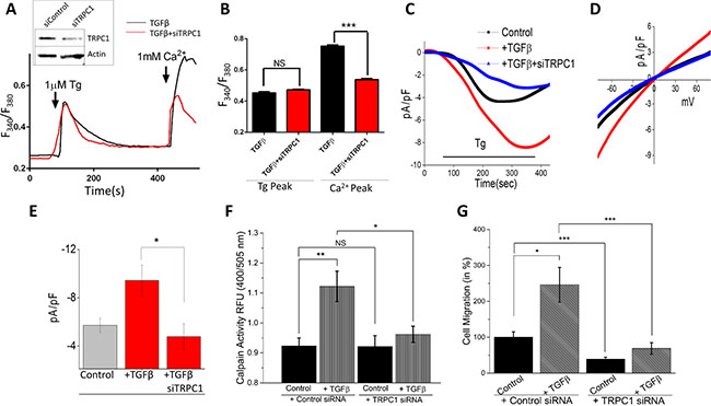 Figure 5: TRPC1 is involved in TGFβ induced EMT. (A inset) TRPC1 was knocked down in NMuMG cells using siRNA with Western blot showing reduction. (A) Representative Fura-2 traces showing the transient increase in [Ca2+]i after addition of 1 mM calcium to siTRPC1 cells with TGFβ pretreatment for 1 hour. (B) Bar diagram quantifies Fura-2 Tg and Ca2+ peaks. Each bar gives the mean ± SEM of 40 separate experiments. (C) Application 1 μM Tg in bath solution induced inward currents at −80 mV in control,TGFβ treated and siTRPC1 cells. Respectively IV curves under these conditions are shown in (D) and quantitation (8–10 recordings) of current intensity at −80 mV is shown in (E). (F) Calpain activity measured as RFU using calpain activity kit from Abcam in siTRPC1 and control cells after treatment with 10 ng/mL TGFβ for 6 hours. Each bar gives the mean ± SEM (N = 4). (G) Transwell migration of siTRPC1 cells after treatment with 10 ng/mL TGFβ for 24 hours and migrated for 6 hours. Four random fields at 10× were counted indicating total cells migrated and shown as percent change.