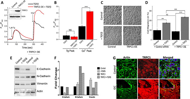 Figure 6: TRPC1 overexpression increases TGFβ induced EMT. (A inset) TRPC1 expression vector showed a more than 2 fold increase in expression. (A) Representative Fura-2 traces showing the transient increase in [Ca2+]i after addition of 1 mM calcium to TRPC1 OE cells with TGFβ pretreatment for 1 hour. (B) Bar diagram quantifies Fura-2 Tg and Ca2+ peaks. Each bar gives the mean ± SEM of 40 separate experiments. (C) Transwell migration of TRPC1 overexpressed NMuMG cells with a 48 hour 10 ng/mL TGFβ treatment and 6 hour migration. Magnification at 10×. (D) Four random fields at 10× were counted indicating total cells migrated and shown as percent change. (E–F) Western blot of TRPC1 OE cells showing E-cadherin, N-cadherin, and Vimentin protein levels normalized to actin with 40 ug of total protein load after 48 hours in 10 ng/mL TGFβ. Quantification displayed as fold change shown in (F). Confocal images showing TRPC1 expression in age matched control and invasive ductal carcinoma (IDC) samples are shown in (G). Anti- actin or anti-TRPC1 antibody were used to label actin (as control) or TRPC1 protein followed by FITC (for actin) or rhodamine (for TRPC1) -conjugated secondary antibodies.