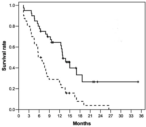 The predicted PFS was the determinant of sample size. On the basis of the varied estimates of the PFS in prior studies [13-15], a PFS of 3.5 months or less was not considered worthy of further investigation. The target enrollment of 32 patients would provide an 80% power to detect a 2-months improvement in PFS with one-sided α of 0.05 and enrollment and follow-up periods of 2.0 and 1.0 years, respectively. To ensure an adequate number of evaluable patients, a total of 40 patients were enrolled.