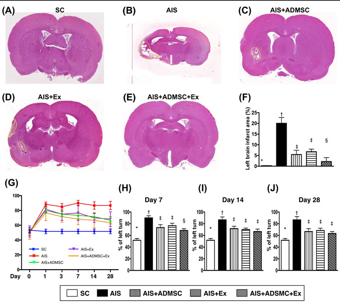 Figure 3: Pathological finding of brain infarct area (BIA) on day 60 and time courses of neurological status after acute ischemic stroke (n = 6). A. to E. Illustrating the H.E. staining (100x) of whole brain cross section for identification of BIA (the yellow dotted line indicated the boundary of BIA). F. Statistical analysis of summated (five cross section in each animal) BIA, * vs. other groups with different symbols (†, ‡, §), p < 0.0001. G. Corner test showing the attainment of a steady state of neurological functional impairment from days 1 to 28 following AIS among groups 2 to 5. Significant improvement in neurological function was found apparently in groups 3 to 5 as compared with group 2 by day 7 after AIS. Further notable improvement by day 14 and more further notable improvement by 28 after AIS were observed in groups 3, 4 and 5 but not in group 2. H. Statistical analysis by day 7, * vs. other groups with different symbols (†, ‡, §), p < 0.01. I. Statistical analysis by day 14, * vs. other groups with different symbols (†, ‡), p < 0.001. J. Statistical analysis by day 14, * vs. other groups with different symbols (†, ‡), p < 0.0001. All statistical analyses were performed by one-way ANOVA, followed by Bonferroni multiple comparison post hoc test. Symbols (*, †, ‡) indicate significance (at 0.05 level). SC = sham control; AIS = acute ischemic stroke; ADMSC = adipose-derived mesenchymal stem cell; Ex = exosome.