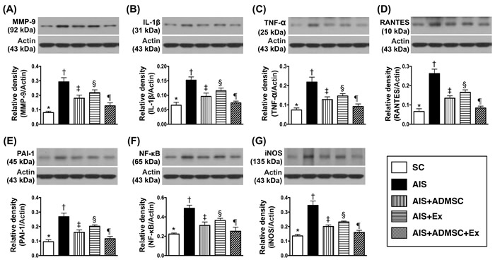 Figure 4: Protein expression of inflammatory biomarkers in brain infarct region by day 60 after AIS (n = 6). A. Protein expression of matrix metalloproteinase (MM9-9), * vs. other groups with different symbols (†, ‡, §, ¶), p < 0.0001. B. Protein expression of interleukin (IL)-1β, * vs. other groups with different symbols (†, ‡, §, ¶), p < 0.0001. C. Protein expression of tumor necrosis factor (TNF)-α, * vs. other groups with different symbols (†, ‡, §, ¶), p < 0.0001. D. Protein expression of RANTES, * vs. other groups with different symbols (†, ‡, §, ¶), p < 0.0001. E. Protein expression of plasminogen activator inhibitor (PAI)-1, * vs. other groups with different symbols (†, ‡, §, ¶), p < 0.0001. F. Protein expression of nuclear factor (NF)- κB, * vs. other groups with different symbols (†, ‡, §, ¶), p < 0.0001. G. Protein expression of inducible nitric oxide synthase (iNOS), * vs. other groups with different symbols (†, ‡, §, ¶), p < 0.0001. All statistical analyses were performed by one-way ANOVA, followed by Bonferroni multiple comparison post hoc test. Symbols (*, †, ‡, §, ¶) indicate significance (at 0.05 level). SC = sham control; AIS = acute ischemic stroke; ADMSC = adipose-derived mesenchymal stem cell; Ex = exosome.