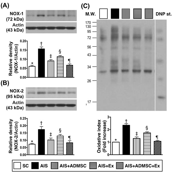 The protein expressions of MMP-9, IL-1β, TNFα, RANTES, PAI-1, NF-κB and iNOS, seven indicators of inflammation, were highest in AIS only, lowest in SC, significantly higher in AIS-ADMSC and AIS-Ex than in AIS-ADMSC-Ex, and significantly higher in AIS-Ex than in AIS-ADMSC. This identical pattern was found among the five groups for protein expression of NOX-1, NOX-2 and oxidized protein, three indicators of oxidative stress.