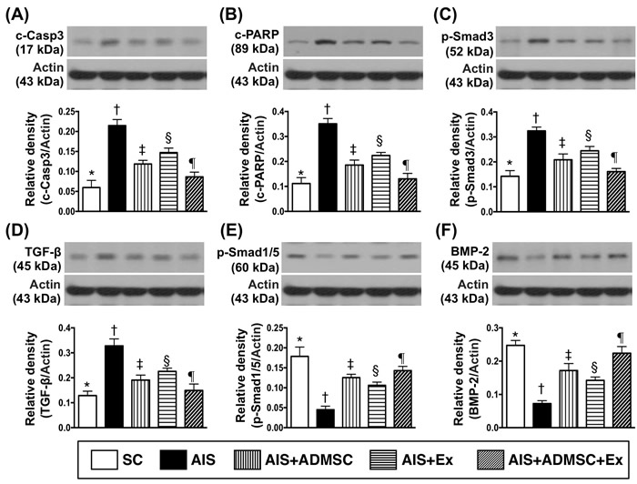 The protein expressions of cleaved caspase 3 and cleaved PARP, two indicators of apoptosis, were highest in AIS only, lowest in SC, significantly higher in AIS-ADMSC and AIS-Ex than in AIS-ADMSC-Ex, and significantly higher in AIS-Ex than in AIS-ADMSC. The protein expressions of Smad3 and TGF-β, two indices of fibrosis, exhibited an identical pattern of apoptosis among the five groups. The protein expressions of Smad1/5 and BMP-2, two indicators of anti-fibrosis, displayed an opposite pattern of apoptosis among the five groups.