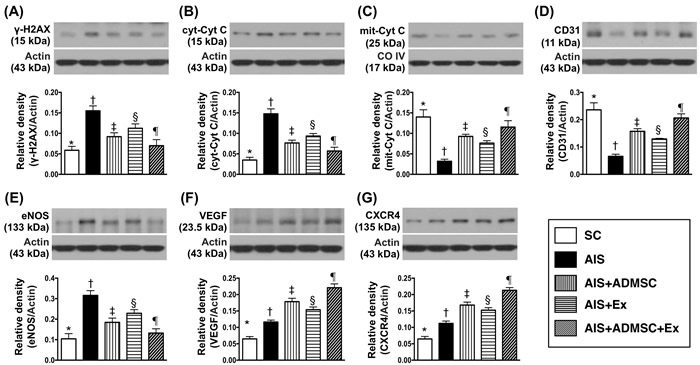 The protein expressions of γ-H2AX, a DNA-damage marker, and cytosolic cytochrome C, a mitochondrial-damage marker, was highest in AIS only, lowest in SC, significantly higher in AIS-ADMSC and AIS-Ex than in AIS-ADMSC-Ex, and significantly higher in AIS-Ex than in AIS-ADMSC. On the other hand, protein expression of mitochondrial cytochrome C, an indicator of mitochondrial integrity, showed an opposite pattern to γ-H2AX among the five groups. Additionally, the protein expressions of CD31 and eNOS, two indicators of endothelial function, exhibited an identical pattern to mitochondrial cytochrome C among the five groups. Furthermore, the protein expressions of VEGF and CXCR4, two indices of angiogenesis, exhibited significantly progressive increases from groups SC to AIS-ADMSC-Ex, suggesting an intrinsic response to ischemic stimulation.