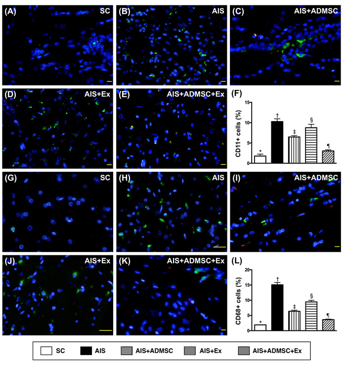 Figure 8: Inflammatory cell expression in brain infarct zone by day 60 after AIS (n = 6). A. to E. Illustrating immunofluorescent (IF) microscopic finding (400x) of CD11+ cells (green color). Red-color indicated Dil-dye stained ADMSC. F. Analytical results of number of CD11+ cells, *vs. other groups with different symbols (†, ‡, §, ¶), p < 0.0001. G. to K. Illustrating IF microscopic findings (400x) of CD68+ cells (green color). Red-color indicated Dil-dye stained ADMSC. L. Analytical results of number of CD68+ cells, *vs. other groups with different symbols (†, ‡, §, ¶), p < 0.0001. Scale bars in right lower corner represent 20µm. All statistical analyses were performed by one-way ANOVA, followed by Bonferroni multiple comparison post hoc test. Symbols (*, †, ‡, §, ¶) indicate significance (at 0.05 level). SC = sham control; AIS = acute ischemic stroke; ADMSC = adipose-derived mesenchymal stem cell; Ex = exosome.