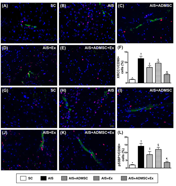 Figure 9: Microscopic findings of double-stranded DNA damaged positively stained cells in brain infarct zone by day 60 after AIS (n = 6). A. to E. Illustrating immunofluorescent (IF) microscopic finding (400x) of XRCC1/CD90+ cells (pink color). F. Analytical results of number of XRCC1/CD90+ cells, *vs. other groups with different symbols (†, ‡, §, ¶), p < 0.0001. G. to K. Illustrating IF microscopic findings (400x) of p53BP1/CD90+ cells (pink color). L. Analytical results of number of p53BP1/CD90+ cells, *vs. other groups with different symbols (†, ‡, §, ¶), p < 0.0001. Scale bars in right lower corner represent 20µm. All statistical analyses were performed by one-way ANOVA, followed by Bonferroni multiple comparison post hoc test. Symbols (*, †, ‡, §, ¶) indicate significance (at 0.05 level). SC = sham control; AIS = acute ischemic stroke; ADMSC = adipose-derived mesenchymal stem cell; Ex = exosome.