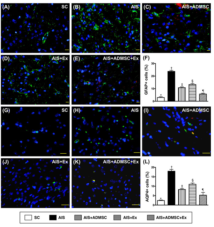 Figure 10: Cellular expressions of GFAP and AQP4 in brain infarct zone by day 60 after AIS (n = 6). A. to E. Immunofluorescent (IF) microscope (400x) identifying glial fibrillary acid protein (GFAP)+ cells (green color). Red-color indicated Dil-dye stained ADMSC. F. Analytical results of number of GFAP+ cells, *vs. other groups with different symbols (†, ‡, §, ¶), p < 0.0001. G. to K. IF microscope (400x) identifying aquaporin 4 (AQP4)+ cells (green color). L. Analytical results of number of GFAP+ cells, *vs. other groups with different symbols (†, ‡, §, ¶), p < 0.0001. Scale bars in right lower corner represent 20µm. All statistical analyses were performed by one-way ANOVA, followed by Bonferroni multiple comparison post hoc test. Symbols (*, †, ‡, §, ¶) indicate significance (at 0.05 level). SC = sham control; AIS = acute ischemic stroke; ADMSC = adipose-derived mesenchymal stem cell; Ex = exosome.