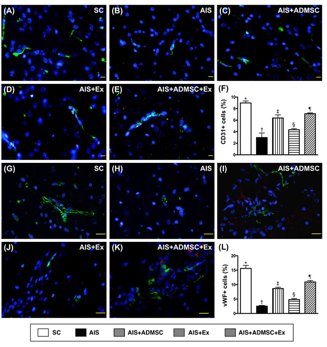 Figure 11: Microscopic findings of expressions of endothelial surface markers in brain infarct zone by day 60 after AIS (n = 6). A. to E. Immunofluorescent (IF) microscopic finding (400x) of CD31+ cells (green color). Red-color indicated Dil-dye stained ADMSC. F. Analytical results of number of CD31+ cells, *vs. other groups with different symbols (†, ‡, §, ¶), p < 0.0001. G. to K. IF microscopic finding (400x) of von Willebrand factor (vWF)+ cells (green color). Red-color indicated Dil-dye stained ADMSC. L. Analytical results of number of vWF+ cells, *vs. other groups with different symbols (†, ‡, §, ¶), p < 0.0001. Scale bars in right lower corner represent 20µm. All statistical analyses were performed by one-way ANOVA, followed by Bonferroni multiple comparison post hoc test. Symbols (*, †, ‡, §, ¶) indicate significance (at 0.05 level). SC = sham control; AIS = acute ischemic stroke; ADMSC = adipose-derived mesenchymal stem cell; Ex = exosome.