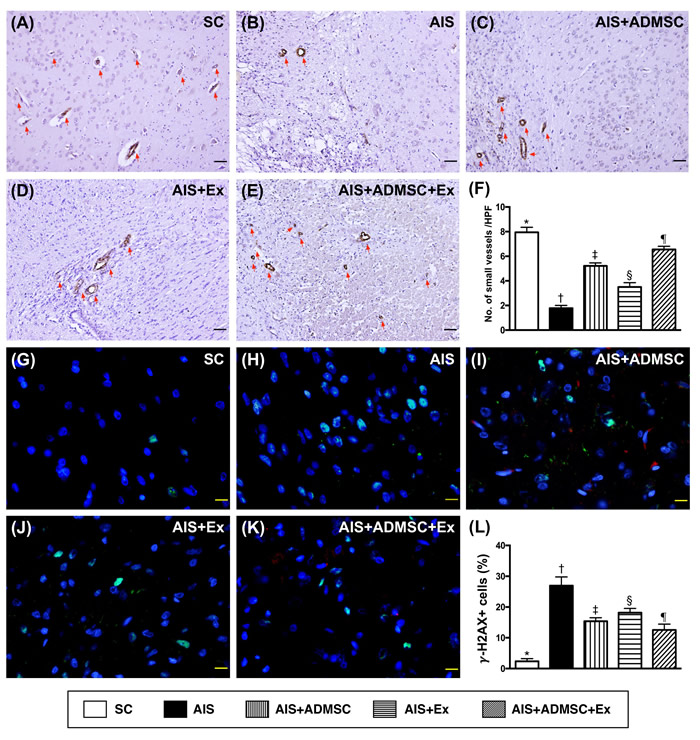 The number of small vessels in BIZ, an indicator of angiogenesis, was highest in SC, lowest in AIS only, significantly higher in AIS-ADMSC-Ex than in AIS-ADMSC and AIS-Ex, and significantly higher in AIS-ADMSC than in AIS-Ex. The γ-H2AX+ cell expression, another DNA-damage biomarker, was highest in AIS only, lowest in SC, significantly higher in AIS-ADMSC and AIS-Ex than in AIS-ADMSC-Ex, and significantly higher in AIS-Ex than in AIS-ADMSC.