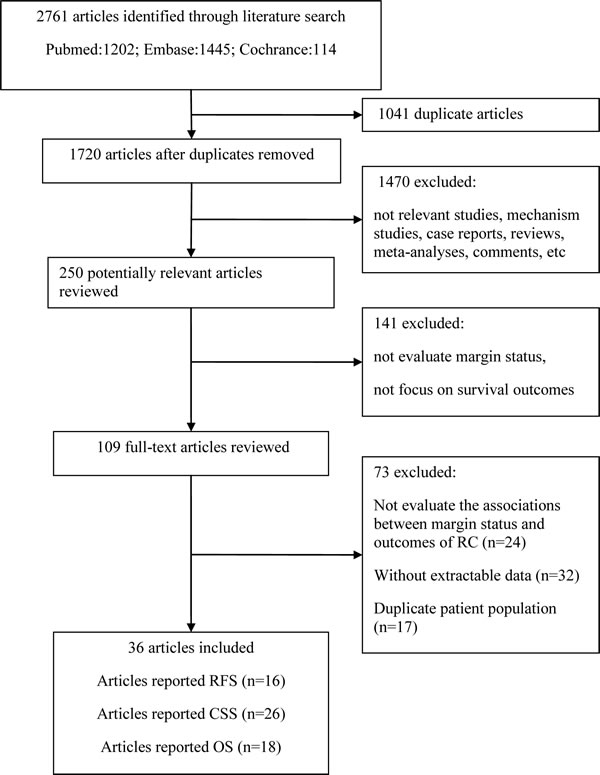 Figure 1 illustrates the process of the literature search. Briefly, a total of 2,761 articles were identified using our search strategy, of which 250 were considered potentially relevant articles after excluding duplicate articles and screening the titles and abstracts. A further 141 articles were excluded because that they did not evaluate margin status, or did not focus on survival outcomes. After assessing the remaining 109 articles by full-text review, 73 articles were excluded; of these, 24 articles did not investigate the associations between surgical margin status and survival outcomes of bladder cancer in patients who had undergone RC, 32 were excluded because they did not report relative risk estimates and the corresponding 95% CI or did not provide the sufficient data to calculate them, and 17 articles were excluded as the participants overlapped with other studies. Finally, a total of 36 articles were included in the meta-analysis. The outcomes used were recurrence-free survival (RFS) in 16 studies, cancer-specific survival (CSS) in 26 studies and overall survival (OS) in 18 studies.