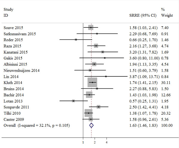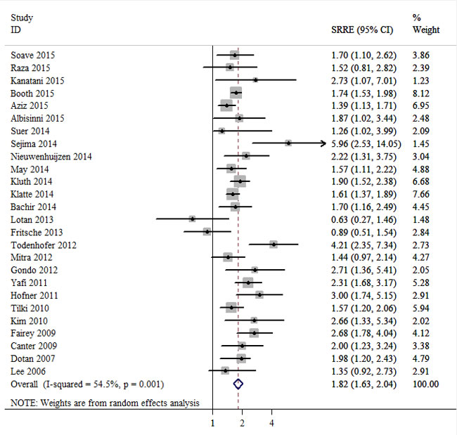 All included studies used multivariable Cox proportional hazards ratio models to examine the associations between surgical margin status and survival outcomes of RC, including RFS, CSS or OS. SRREs and 95% CIs were calculated in order to compare the positive margin group with the negative margin group. Heterogeneity between studies was assessed using the Q and I2 statistics. P < 0.10 or I2>50% were used to indicate heterogeneity. Random effects models were used for meta-analysis in cases of heterogeneity. Forest plots were also applied to assess the relationships between margin status and survival outcomes of bladder cancer treated by RC.