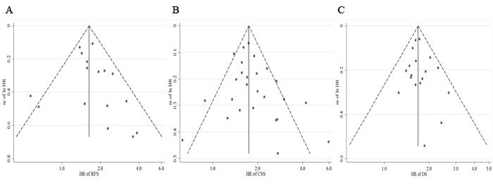 Figure 5: Funnel plots for publication bias of the hazard ratios (HRs) of (A) recurrence-free survival (RFS), (B) cancer-specific survival (CSS), and (C) overall survival (OS).