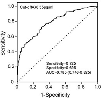 To evaluate serum MACC1 as a BC diagnostic biomarker, we calculated the ROC by plotting sensitivity against specificity for serum MACC1 in different groups. We found that serum MACC1 successfully discriminated BC patients from healthy controls (AUC = 0.785, 95% CI: 0.746–0.825). An optimal cut-off value (38.35 pg/ml), which is of critical importance to accurate BC diagnosis, was determined by the score closest to the value under peak sensitivity (0.725) and specificity (0.696) (Figure 2).