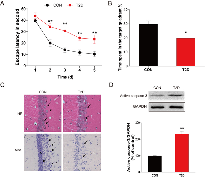 Figure 1: Chronic T2DM (T2D) caused cognitive deficits and neural cells apoptosis. A. The performance of spatial memory acquisition phase 4 weeks after hyperglycemia onset in T2D and age-matched CON groups. B. The mean percentage of time spent in the target quadrant of CON and T2D groups, in which the platform had previously been located during acquisition. C. The results of H&E staining and Nissl staining in the hippocampal CA1 region for the CON and T2D groups. D. Western blot analysis to determine the expression of active caspase-3 in the hippocampal CA1 region of CON and T2D rats. Data were presented as mean ± SD from 8 mice in each group (n = 8). *P < 0.05, **P < 0.01 versus the CON group.
