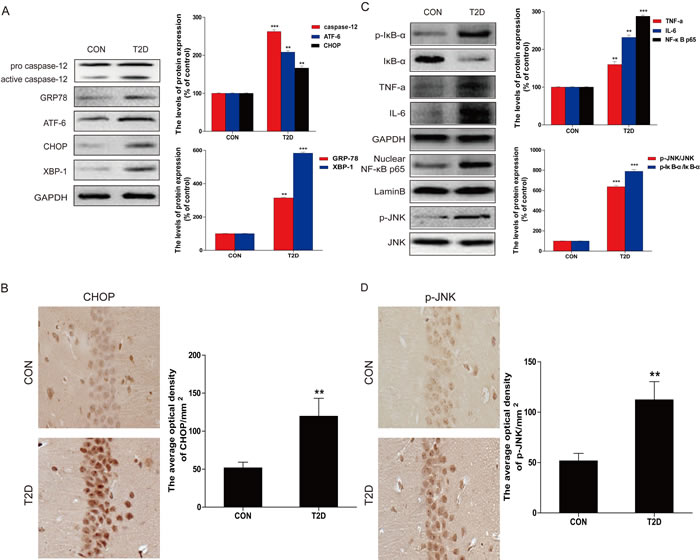 Figure 2: Hippocampal ER stress and inflammatory response were involved in T2D. A. Protein extracts prepared from hippocampal region cells were subjected to immunoblotting to determine the expression of caspase-12, ATF-6, GRP78, CHOP, and XBP-1 in the hippocampal CA1 region of CON and T2D rats, and the optical density analysis of caspase-12, ATF-6, GRP78, CHOP, and XBP-1. B. Western blot analysis to determine the expression of p-IκB, IκBα, TNFα, IL-6 and NF-κB (p65) in the hippocampal region. C. Immunohistochemistry analysis for CHOP in hippocampal CA1 region of CON and T2D rats group. And the quantitative analysis of relative amount of CHOP in hippocampal CA1 region. D. Immunohistochemistry analysis for p-JNK in hippocampal CA1 region of CON and T2D rats group. Data were presented as mean ± SD (n = 8). *P < 0.05, **P < 0.01, ***P < 0.001 versus the CON group.