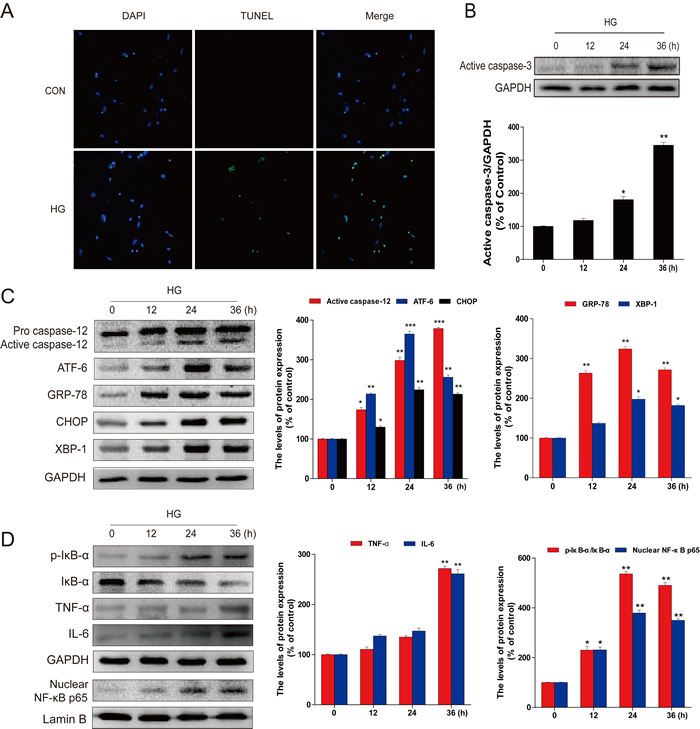 To mechanistically investigate the roles of ER and associated inflammation in diabetes-induced hippocampus neuronal cell death, we established an in vitro diabetes-mimic model with primary hippocampus neurons exposed to HG (27.5 mM) in addition of medium containing 25 mM glucose (total 52.5 mM), as previously reported [22]. TUNEL assay showed a significant increase of TUNEL-positive neurons at 36 h after HG treatment (Figure 3A), along with a gradual increase of the active caspase-3 from 12 h to 36 h (Figure 3B). We also demonstrated significant increases of ER stress and inflammation responses in HG-induced neuronal cells, marked as increased expressions of cleaved caspase-12 and CHOP, as index of ER stress related pro-apoptotic mediators, and ATF-6, GRP-78 and XBP-1, as index of ER stress (Figure 3C), as well as increased expressions of p-IκB, IκB-α, TNF-α, IL-6, and p65, as index of inflammatory responses (Figure 3D). Collectively, HG-exposed primary culture of primary hippocampal neurons also recaptured what we have found in animal models (Figures 1-2), shown by increased hippocampal apoptosis, inflammation, and RE stress.