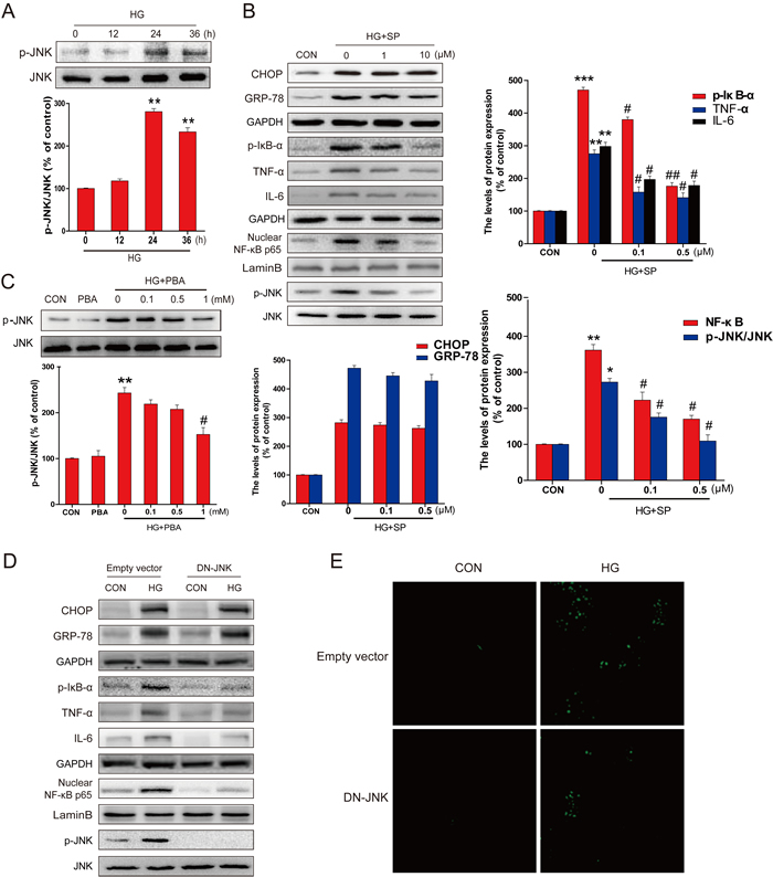 4-phenylbutyrate (4-PBA) was purchased from Sigma Co. (Sigma-Aldrich, St. Louis, MO). Dulbecco’s Modified Eagle Medium (DMEM), F12 and Fetal Bovine Serum (FBS) were purchased from Invitrogen (Invitrogen, Carlasbad CA). Primary antibodies against GRP78, CHOP, XBP-1, TNF-α, IL-6, caspase-12, Lamin B, GAPDH, IκB-α, NF-κB p65, ATF-6, p-JNK, JNK and IgG-HRP were purchased from Cell Signaling Technology, Inc. (Shanghai, China). A 3.3-kb cDNA fragment (dominant-negative type) encoding HA-tagged JNKK2 (DM)-JNK1 fusion protein, in which lysine 149 in the ATP domain of the JNKK2 moiety was replaced by methionine, and vector cDNA (control) were used, as previously described. Enhanced chemiluminescence (ECL) Kit was purchased from Bio-Rad (Hercules, CA). STZ, thapsigargin, tunicamycin, JNK inhibitor SP600125, and all of the other reagents were purchased from Sigma Co. and otherwise specified.