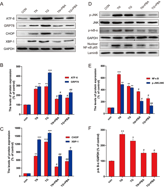 Figure 6: PBA administration inhibited the expression of ER-stress and inflammatory protein in the primary hippocampal neurons which induced by thapsigargin (TG) and tumicamycin (TN). A. Western blot expression of ATF-6, GRP78, CHOP, XBP-1 in primary hippocampal neurons after treated with TG, TN alone or with PBA. B. The optical density analysis of ATF-6, GRP78. C. The optical density analysis of CHOP, XBP-1. D. The expression of p-JNK, p-IκB and NF-κB (p65) in primary hippocampal neurons after treated with TG, TN alone or with PBA. (E-F). The optical density of p-JNK, NF-κB and p-IκB. Data were presented as mean ± SD (n = 8). *P < 0.05, **P < 0.01, ***P < 0.001 versus the sham group, #P < 0.05, ##P < 0.01 versus the TG, TN treatment group.