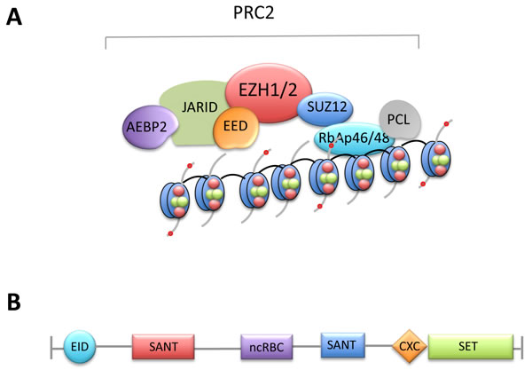 Figure 1: A. The polycomb complex PRC2. PRC2 contains EZH2 or EZH1 and four key components, EED, EZH1/2, Suz12 and RbAp46/48, which are required for its enzymatic activity. AEBP2, PCL and JARID2 are also components of the PRC2 complex but their precise role is currently unclear. B. Characterized domains of EZH2. EID, EED interaction domain; SANT, SWI3, ADA2, N-CoR and TFIIIB DNA-binding domain; ncRBD, non-coding-RNA-binding domain; CXC, cysteine-rich domain; SET, Su(var)3-9, enhancer of zeste, trithorax domain.