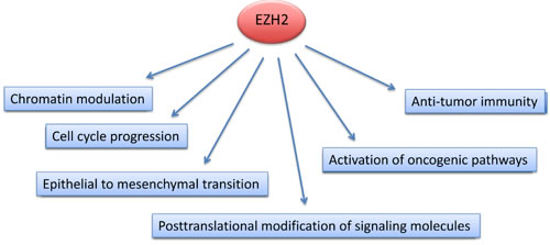 EZH2 expression and activity in cancer cells is altered at genetic, transcriptional, post-transcriptional and post-translational levels. The complexity of EZH2 regulation by multiple molecular pathways, most likely contributes to the variable implications of EZH2 aberrations in various types of cancer.