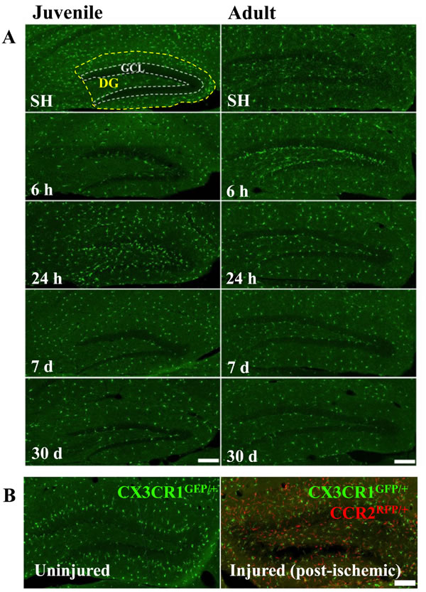 Figure 2: Irradiation did not recruit peripheral monocytes into the hippocampus. No CCR2RFP/+-labeled cells were detected in the hippocampus at any of the time points after IR, neither in juvenile nor in adult brains. Scale bar, 150 µm (A). Unlike after IR, infiltrating monocyte-derived macrophages (CCR2RFP/+-labled cells, red) appeared in the injured hippocampus already 1 day after an ischemic insult (B., right panel), in contrast to the uninjured hippocampus where only CX3CR1GFP/+-labeled cells (green) were detected (B, left panel). Scale bar, 100 µm. DG = dentate gyrus, GCL = granule cell layer.