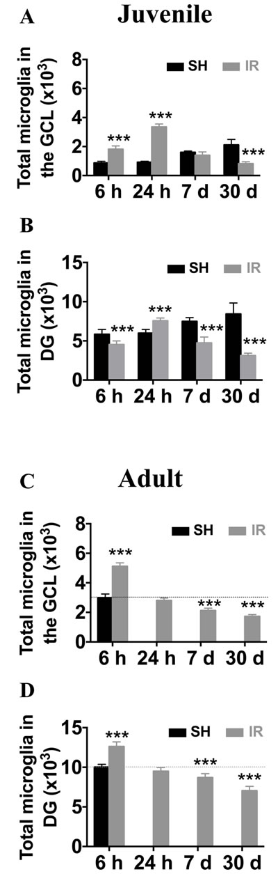 Figure 4: Irradiation induced a more pronounced and protracted microglia increase in the juvenile hippocampus. The numbers of microglia were quantified in the GCL (including the SGZ) and the entire DG in sham controls (SH) or 6 h, 24 h, 7 days and 30 days after irradiation (IR). Data are shown as mean ± S.D., n = 6 for the sham groups, n = 10-11 for the irradiated groups. Asterisks indicate comparison between irradiated groups and the corresponding sham controls. For the juvenile brains, each time point is compared with a separate control group, taking into account possible developmental changes. ***P < 0.001.