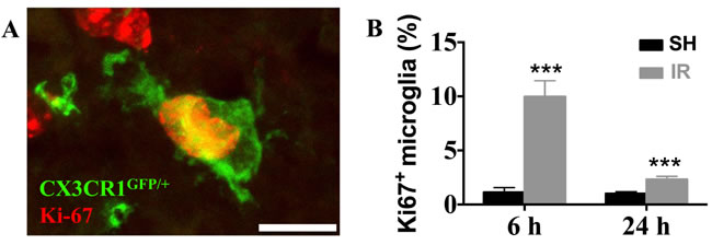 Figure 5: Irradiation induced microglial proliferation only in the juvenile brain. A representative microphotograph showing co-localization of microglia (CX3CR1GFP/+, green) and Ki67 (red) in the juvenile DG after IR, indicating proliferating microglia (A) In juvenile brains, microglial proliferation was increased 6 h and 1 d after IR (B) No Ki67-positive microglia could be detected in the DG of adult brains.