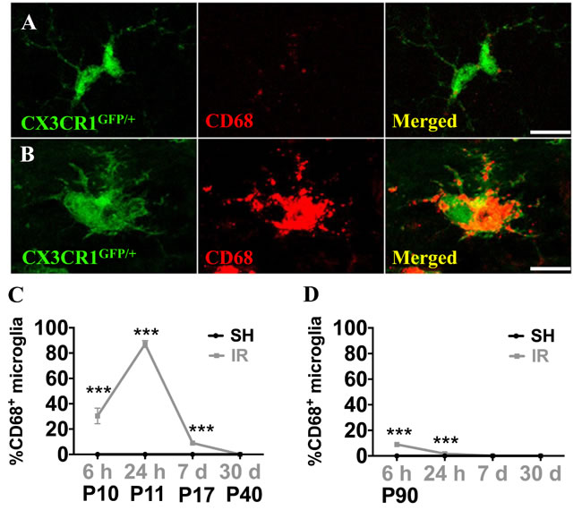 Figure 8: Microglia in the SGZ expressed CD68 after irradiation. CD68 expression was very low in ramified microglia in sham controls, but increased strongly in some microglia after IR (A, B) The numbers of microglia with high CD68 staining (as in B) were counted. Percentages of microglia with high CD68 expression over the total number of microglia in the SGZ after sham irradiation (SH) or 6 h, 1 day, 1 week and 1 month after irradiation (IR) in juvenile (C)and adult (D) brains. Data are shown as mean ± S.D., n = 6 for the sham groups, 10-11 for the irradiated groups. Asterisks indicate comparison between irradiated groups and the corresponding sham controls. ***P < 0.001. Scale bars, 10 µm.
