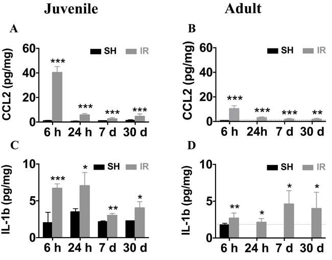 CCL2 is one of the most strongly upregulated cytokines or chemokines after IR in both juvenile and adult rodent brains [23, 25, 41]. In addition, IL-1β is a key pro-inflammatory cytokine that drives neuroinflammatory processes in a variety of neurodegenerative diseases and exerts neurotoxic effects [42-44]. We determined the time courses of CCL2 and IL-1β expression in the juvenile and adult mouse hippocampus after IR by using ELISA, demonstrating that the CCL2 expression peaked 6 h after IR in both juvenile (Figure 11A) and adult (Figure 11B) brains, with 4-fold higher levels in the juvenile hippocampus (40.4 ± 1.4 vs. 10.4 ± 0.8 pg/mg). The expression of IL-1β at 6 h after IR was more than twice as high in the juvenile hippocampus when compared with its adult counterpart (Figure 11C-11D, 6.7 ± 0.6 vs. 2.7 ± 0.7 pg/mg). Importantly, the levels remained increased at all the time points investigated after IR in the hippocampus, i.e. for at least 30 days, both in juvenile and adult brains (Figure 11A-11D), suggesting that IR induced a chronic inflammation.