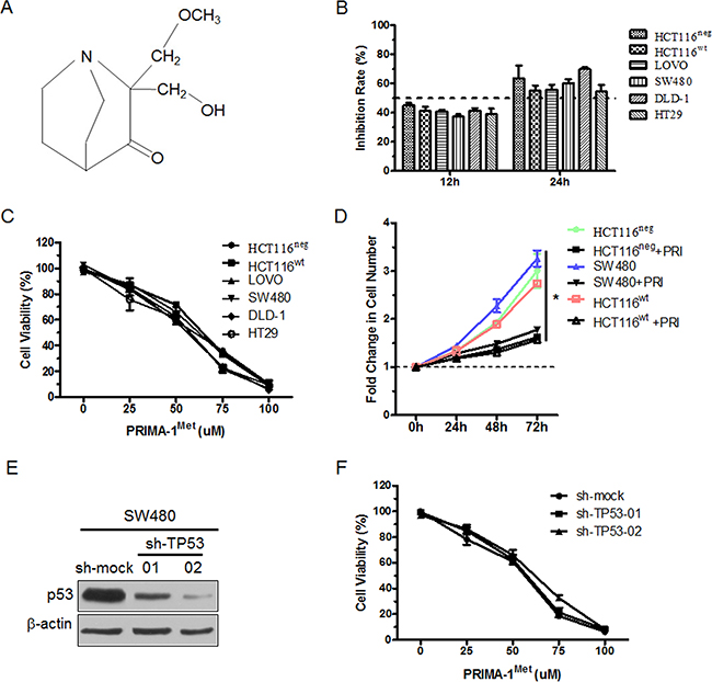 Figure 1: PRIMA-1Met inhibited the proliferation of CRC cells with different p53 status. A. Chemical structure of PRIMA-1Met. B. CRC cells with different p53 status were treated with 25 uM PRIMA-1Met for 12 or 24 h. The cell viability was measured by MTS assay. C. Six colorectal cancer cells were exposed to PRIMA-1Met with various concentrations for 24 h and cell viability was measured by MTS assay. D. 1×106 HCT116wt, HCT116neg or SW480 cells were treated with 25 uM PRIMA-1Met or control. Growth curve was measured by counting cell number at indicated time point. *P<0.05. PRI: PRIMA-1Met. E. SW480 cells were transiently transfected with sh-TP53 or sh-mock and p53 expression was analyzed by Western blot analysis. F. SW480 cells transfected with sh-mock or sh-TP53 were treated with various concentrations of PRIMA-1Met for 24 h and cell viability was measured by MTS assay. All data were shown as mean ± SEM from triplicate experiments.