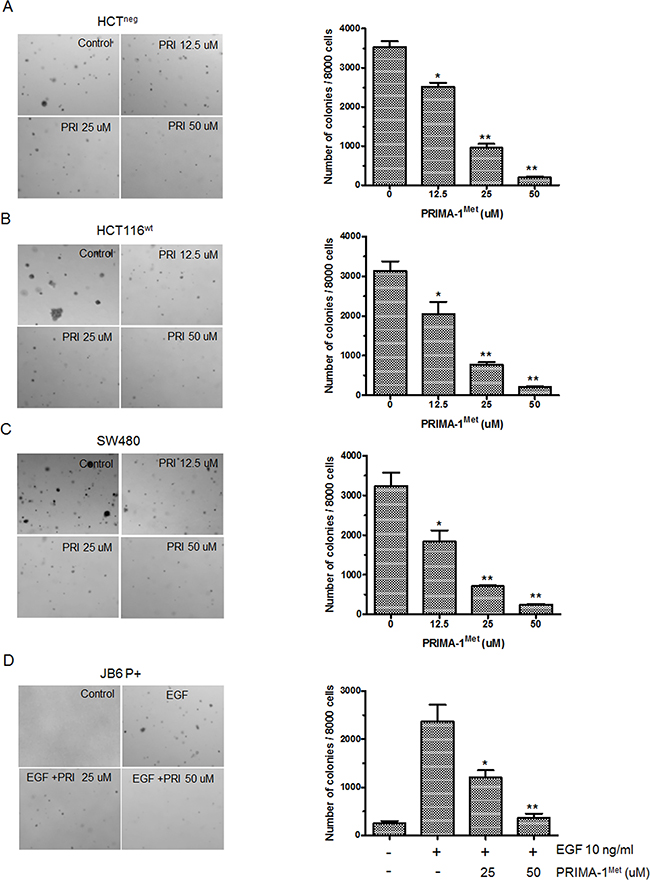 Figure 2: PRIMA-1Met inhibited anchorage-independent growth of colorectal cancer cells and EGF-induced neoplastic transformation of JB6 P+ cells. A-C., Representative images of colony formation. Cells were seeded in soft agar with the addition of different concentration of PRIMA-1Met (0, 12.5, 25, 50 uM) and cultured for 7 days (SW480 and HCT116neg) or 10 days (HCT116wt), then colonies were counted. Data were shown as mean ± SEM from triplicate experiments. **P<0.01 vs. vehicle group. PRI: PRIMA-1Met. D. JB6 P+ cells were cultured with or without EGF (10 ng/ml) and different concentrations of PRIMA-1Met (0, 25, 50 uM) for 7 days, then colonies were counted. Data were shown as mean ± SEM from triplicate experiments. * P<0.05; **, P<0.01 vs. EGF single group. PRI: PRIMA-1Met.