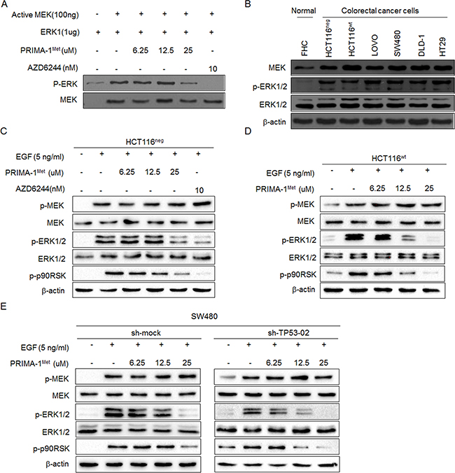 Figure 3: PRIMA-1Met inhibited kinase activity of MEK in vitro and in cells. A. Representative results of in vitro kinase assay. Inactive ERK1 protein was used as a substrate and mixed with active MEK kinase and different doses of PRIMA-1Met. The phosphorylation level of ERK1 (Thr202/Tyr204) was detected by Western blot analysis. Total MEK was used as loading control and MEK inhibitor AZD6244 was used as a positive control. B. Western blot analysis of MEK protein expression level in six colorectal cancer cell lines and normal colon epithelial cell line FHC. The activation of MEK signaling was detected in HCT116neg C., HCT116wt D. and SW480 E. cells. After starvation in serum-free medium for 24 h, cells were treated with different doses of PRIMA-1Met for 12 h and then treated with 5 ng/ml EGF for 30 min. AZD6244 was used as a positive control. Data were representative results from three independent experiments.