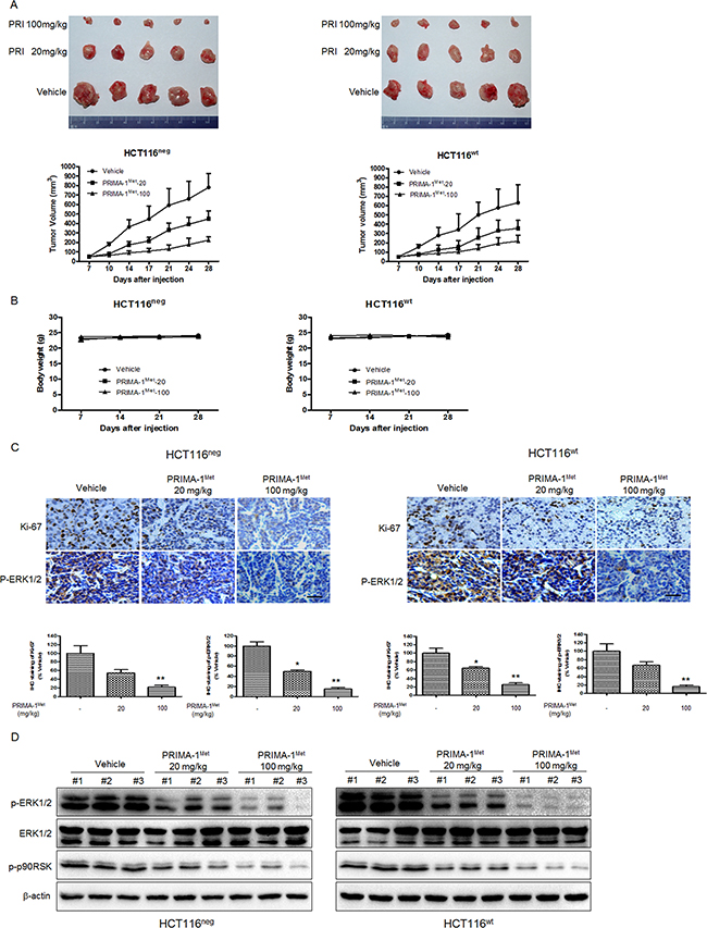 To confirm that the anti-tumor activity of PRIMA-1Met is mediated by MEK in vivo, we established subcutaneous xenograft nude mice model implanted with HCT116neg or HCT116wt cells. Once the tumor xenografts grew to approximately 50 mm3, the mice were randomly assigned to three groups: vehicle (treated with PBS); lower dose of PRIMA-1Met (20 mg/kg); and higher dose of PRIMA-1Met (100 mg/kg). PRIMA-1Met markedly reduced tumor size in both HCT116neg and HCT116wt derived xenografts in a dose dependent manner (Figure 6A). Compared to vehicle group, PRIMA-1Met (20 mg/kg or 100 mg/kg) significantly inhibited average tumor volume (P < 0.05). In addition, body weight was not significantly affected by PRIMA-1Met (Figure 6B), indicating that treatment dose of PRIMA-1Met was well tolerated by the mice.