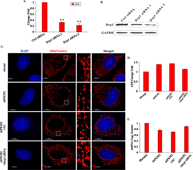 Figure 3: Drp1 is involved in PKM2-induced mitochondrial fusion. A. and B. Drp1 expression is decreased following Drp1 siRNAs treatment. The shPKM2 cells were transfected with Drp1 siRNAs, then cells were harvested, the mRNA and protein expression levels of Drp1 were analyzed by qPCR and western blot, respectively. **p < 0.01. C. Drp1 siRNA treatment cells show restored mitochondrial morphology. After the shPKM2 cells were treated with Drp1 siRNAs, mitochondria were stained with Mitotracker dye and the morphology was observed by confocal fluorescent microscope. Insets are magnifications of the mitochondria at the indicated areas. D. The ATP production is decreased in Drp1 siRNA treatment cells. After the shPKM2 cells were treated with Drp1 siRNAs, the ATP production was detected. E. The mtDNA copy number is increased in Drp1 siRNA treatment cells. After the shPKM2 cells were treated with Drp1 siRNAs, the mtDNA copy number was detected.