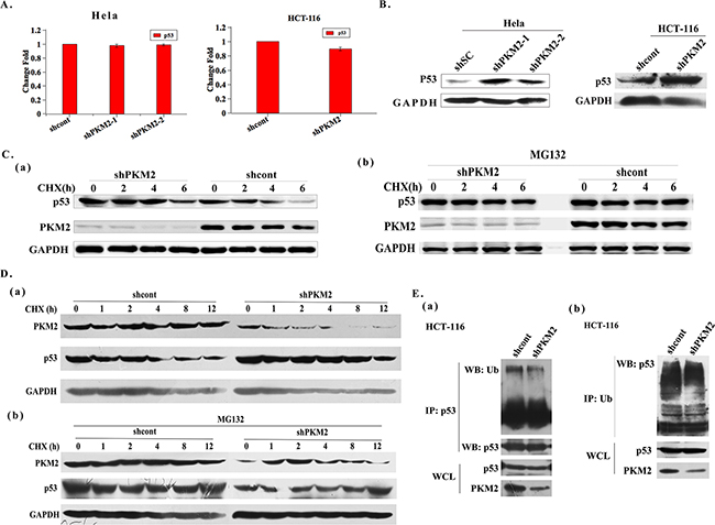 Figure 5: Knockdown of PKM2 induces p53 up-regulation through increasing p53 protein stability. A. qPCR evaluation of p53 mRNA expression in PKM2 knockdown HeLa or HCT-116 cells. B. PKM2 knockdown cells exhibit increased p53 protein levels. HeLa or HCT-116 cells were infected with shcont or shPKM2 lentivirus and harvested after 24 h. Cell lysates were analyzed by western blot. C. (a) Knockdown of PKM2 increases the half-life of p53. HeLa cells were infected with shcont or shPKM2 lentivirus for 24 h and then treated with CHX (20 μg/mL). Cells were harvested at the indicated time and lysates were used to detect p53. (b) MG132 rescues the decreased level of p53 protein. HeLa cells were infected with shcont or shPKM2 lentivirus for 24 h, then the cells were treated with MG132 (20 μM) for 6 h and CHX (20 μg/mL) for the indicated periods of time, cell lysates were analyzed by western blot. D. (a) Knockdown of PKM2 increases the half-life of p53. HCT-116 cells were infected with shcont or shPKM2 lentivirus for 24 h and then treated with CHX (20 μg/mL). Cells were harvested at the indicated time and lysates were used to detect p53. (b) MG132 rescues the decreased level of p53 protein. HCT-116 cells were infected with shcont or shPKM2 lentivirus for 24 h, then the cells were treated with MG132 (20 μM) for 6 h and CHX (20 μg/mL) for the indicated periods of time, cell lysates were analyzed by western blot. E. (a) Knockdown of PKM2 decreases p53 ubiquitination. HCT-116 cells were infected with shcont or shPKM2 lentivirus for 24 h, and then treated with MG132 (20 μM) for 6 h. Cells lysates were prepared by using SDS lysis buffer and p53 proteins were immunoprecipitated to detect ubiquitination. (b) Knockdown of PKM2 decreases p53 ubiquitination. HCT-116 cells were infected with shcont or shPKM2 lentivirus for 24 h, and then treated with MG132 (20 μM) for 6 h. Cells lysates were prepared by using SDS lysis buffer and ubiquitin proteins were immunoprecipitated to detect ubiquitination.