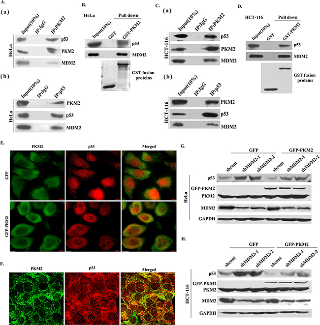 Figure 6: PKM2 binds with both p53 and MDM2. A. (a) and (b) Endogenous PKM2 binds to both p53 and MDM2. HeLa cell lysates were used for immunoprecipitation and immunoblotting. B. PKM2 directly interacts with p53 and MDM2. HeLa cell lysates was incubated with purified GST or GST-PKM2 protein coupled to GSH-Sepharose. Proteins retained on Sepharose were blotted with the indicated antibodies. C. (a) and (b) Endogenous PKM2 binds to both p53 and MDM2. HCT-116 cell lysates were used for immunoprecipitation and immunoblotting. D. PKM2 directly interacts with p53 and MDM2. HCT-116 cell lysates was incubated with purified GST or GST-PKM2 protein coupled to GSH-Sepharose. Proteins retained on Sepharose were blotted with the indicated antibodies. E. Colocalization of GFP-PKM2 and p53. HeLa cells transfected with GFP or GFP-PKM2 was immunostained with TRITC-conjugated anti-p53 antibody. F. Colocalization of endogenous PKM2 and p53. HeLa cells were stained with FITC-conjugated anti-PKM2 and TRITC-conjugated anti-p53 antibodies. G. and H. MDM2 is mediated the PKM2-induced p53 decrease. HeLa and HCT-116 cells were co-transfected with GFP or GFP-PKM2 and shcont or shMDM2, the expression of p53 was detected by western blot.