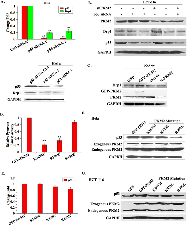 Figure 7: The dimeric PKM2 plays a dominant role in regulating p53 expression. A. qPCR and western blot evaluation of p53 and Drp1 mRNA and protein expression in HeLa shPKM2 cells in which p53 was knocked down by siRNA. The cells were collected for analysis after 48 h transfection. The cells transfected with non-target siRNA (ctrl siRNA) were as control. *p < 0.05, **p < 0.01. B. Western blot analysis of p53 and Drp1 expression in HCT-116 shPKM2 cells in which p53 was knocked down by siRNAs. C. Drp1 expression in HCT-116 p53-/- cells. HCT-116 p53-/- cells were infected with GFP, PKM2, shcont or shPKM2 lentivirus for 48 h and cell lysates were analyzed by western blot. D. HeLa cells were infected with PKM2, PKM2-K367M, PKM2-R399E or PKM2-K433E lentivirus for 48 h, the pyruvate kinase activity was evaluated by a pyruvate kinase activity assay kit according to the manufacturer’s instructions. **p < 0.01. E. HeLa cells were infected with PKM2, PKM2-K367M, PKM2-R399E or PKM2-K433E lentivirus. 48 h later, the p53 expression level was evaluated by qPCR. F. and G. HeLa and HCT-116 cells were infected with PKM2, PKM2-K367M, PKM2-R399E or PKM2-K433E lentivirus. 48 h later, the p53 expression level was evaluated by western blot.