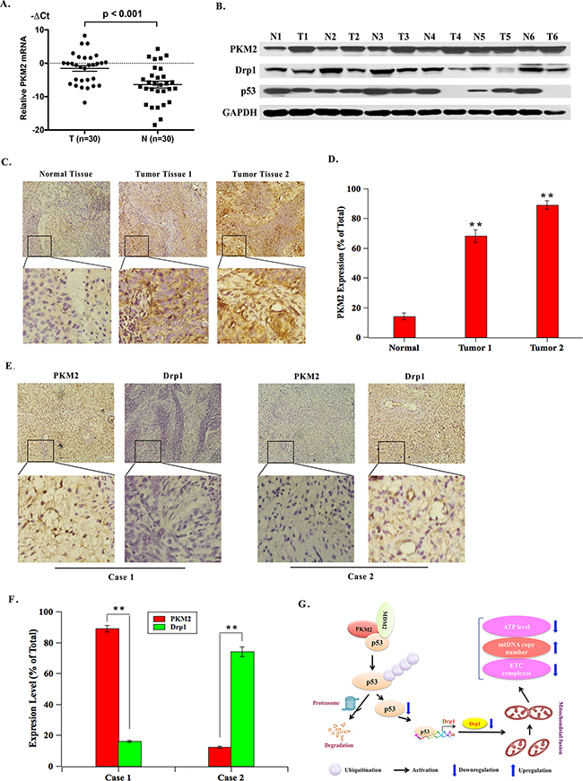 Figure 8: PKM2 is overexpressed in cervical cancer tissues and its expression is reversely correlated with Drp1 expression in clinical samples. A. qPCR evaluation of PKM2 mRNA expression in 30 pairs of fresh cervical cancer tissues. (T, tumorous tissue; N, nontumorous tissue). B. Representative western blot of PKM2, Drp1 and p53 protein expression in 30 pairs of fresh cervical cancer tissues. (T, tumorous tissue; N, nontumorous tissue). C. PKM2 expression was determined by IHC. Representative images of strong/weak staining in clinical samples of cervical cancer and negative staining in the nontumorous samples were showed. D. The statistical analysis of PKM2 expression. **p < 0.01. E. The relationship of PKM2 and Drp1 in clinical samples was determined by IHC. Representative immunohistochemical images of PKM2 and Drp1 were showed. F. The statistical analysis of the correlation between PKM2 and Drp1. **p < 0.01. G. The schematic of PKM2 regulating mitochondria dysfunction. PKM2 binds to both p53 and MDM2 to form a ternary complex, promoting p53 ubiquitination and degradation, subsequently its downstream target Drp1. Drp1 reduction then results in mitochondria dysfunction.