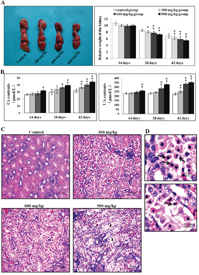 Figure 1: Pathological changes in the kidney. A. Changes in kidney size and relative weight at 42 d. B. Changes in serum creatinine and uric acid levels. C. Histopathological changes in the kidney at 42 d. Control group: no changes observed; 300 mg/kg group: tubular cells show granular and vacuolar degeneration, few necrotic tubular cells and apoptotic tubular cells are observed; 600 mg/kg group: tubular cells show marked granular and vacuolar degeneration, some necrotic tubular cells and apoptotic tubular cells are observed; 900 mg/kg group: Many necrotic tubular cells (▲) and apoptotic tubular cells (↑) are observed. (H·E ×400). D. Morphological changes in apoptotic cells. Apoptotic cell cytoplasm was intensely eosinophilic, and nuclei were shrunken, dense, ring-shaped or crescentic. Some apoptotic cell nuclei were cracked into two or multiple apoptotic bodies (↑). (H·E ×1000). Data are presented as means ± standard deviation (n=5). *P<0.05, **P<0.01 compared with the control group.