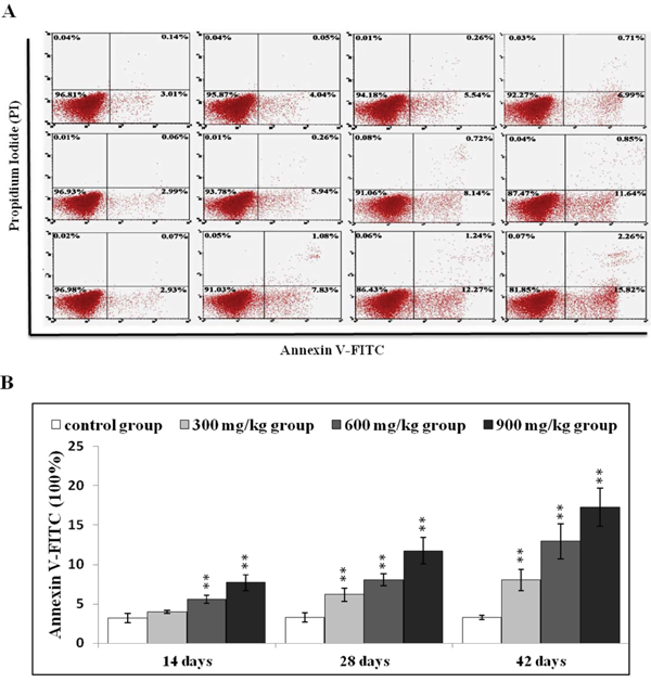 After NiCl2 treatment, renal cells were labeled using Annexin V-FITC and PI to discriminate live (Annexin V-FITC- and PI-), early apoptotic (Annexin V-FITC+ and PI-), late apoptotic (Annexin V-FITC+ and PI+) and primary/secondary necrotic cells (Annexin V-FITC− and PI+). Apoptotic cells (early apoptotic + late apoptotic cells) were more prevalent in the 600 mg/kg and 900 mg/kg groups at 14 d compared to the control group (P<0.05 or P<0.01) (Figure 2), and increased in the three NiCl2-treated groups from 28 to 42 d (P<0.05 or P<0.01).